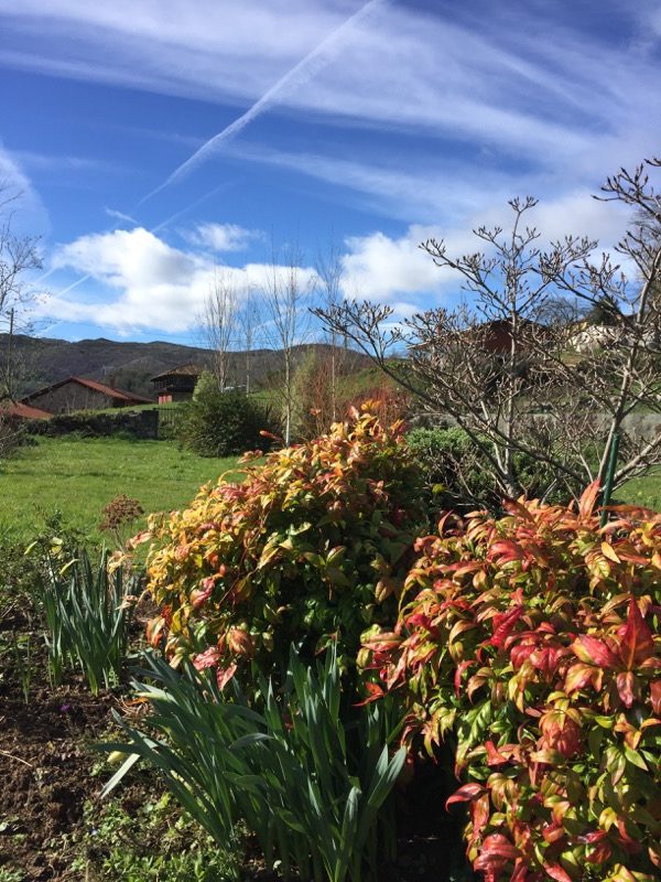 There is a picnic table with a parasol, lawn chairs, seats and all the peace of the Asturian countryside.